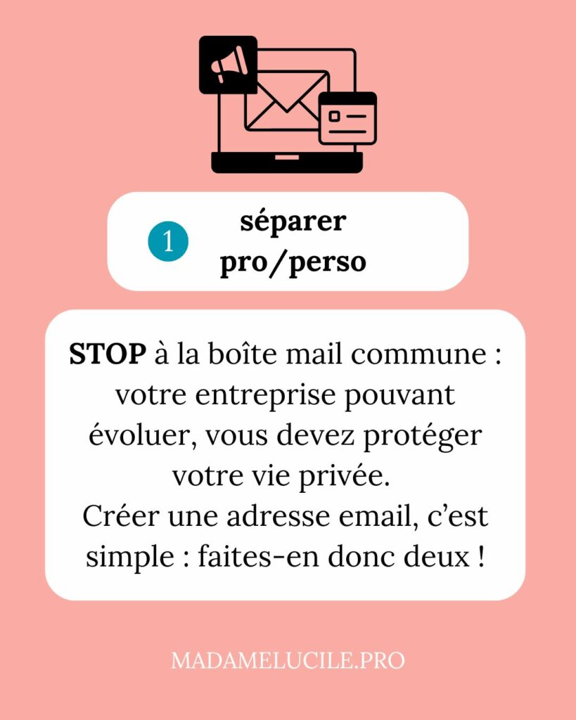 1 : Séparer la vie personnelle de la vie professionnelle, c’est la base ! Pour plein de raisons, il est nécessaire que vous protégiez votre vie privée en ayant 2 boites mail distinctes. De plus, il est plus professionnel d’avoir une adresse email qui porte le nom de votre entreprise ! Créer une adresse email c’est simple, donc faites-en deux…
