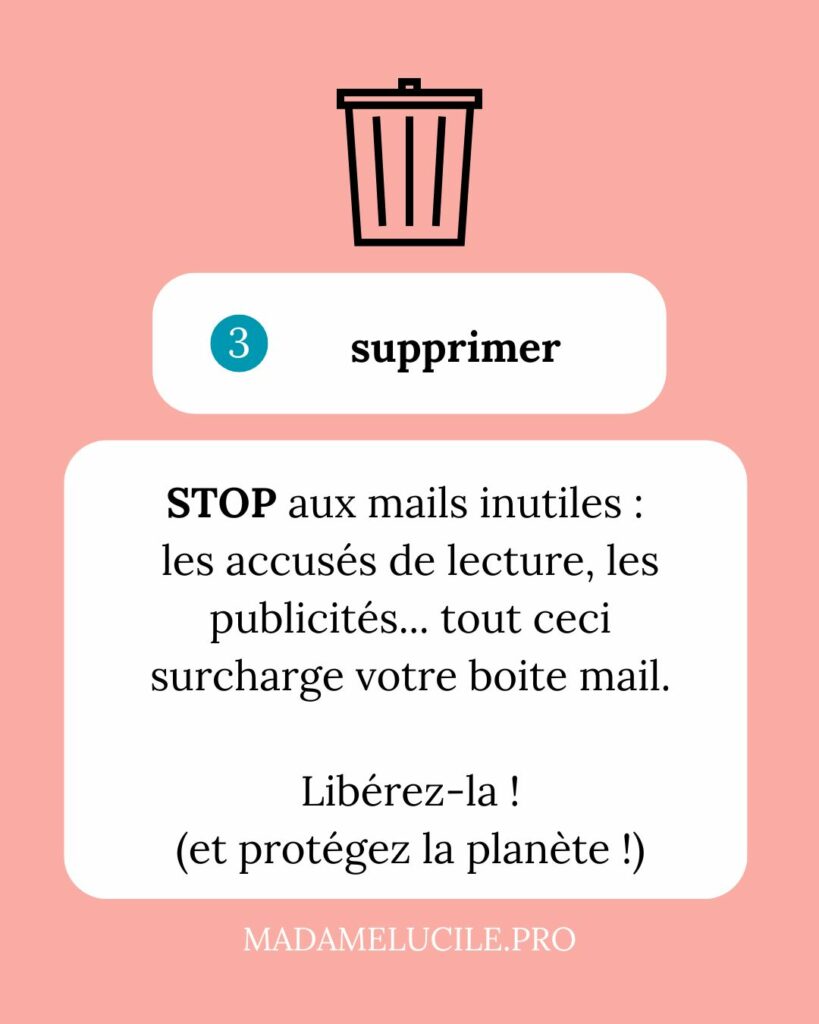 3 : mail traité ? pièce jointe imprimée ou archivée ?… ne gardez pas le mail ! Faites du tri et supprimez régulièrement ce qui n’a plus lieu d’être !
