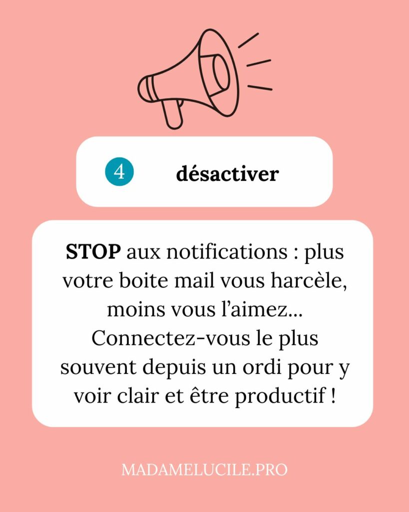 4 : Libérez-vous la tête ! Désactivez les notifications et accordez-vous des moments de qualité. La boite mail, c’est comme le courrier ; si c’est urgent, les gens vous appeleront… Sachez faire le tri et priorisez !